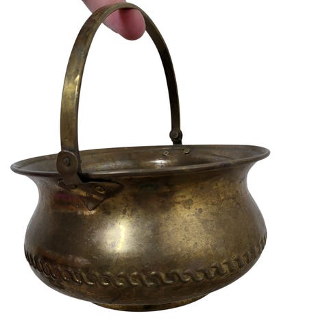 Vanha messinkinen italialainen sarja; kaksi kynttelikköa ja kannu/vaasi.