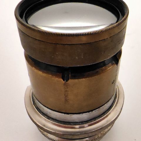 Vanha messinkiobjektiivi, ikää vaikea sanoa mutta lienee lähempänä sataa vuotta. Ei suljinta, ei asennusrengasta, ei valmistajatietoa. Aukot 11-64, poltoväliarvio jossain 9-10 tuuman tietämillä. Ei mikään virheetön, mutta ikäisekseen hyvässä kunnossa.