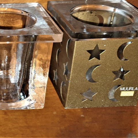 2 kappaletta mustikansinisiä Muurlan tuikkukippoja yhteishintaan. Halkaisija 8 cm ja korkeus 3 cm.