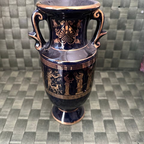 Kreikkalainen maljakko/amfora maalattu Antiikin Kreikan aiheisilla kuvilla. Uusi. Erinomaisessa kunnossa, täysin ehjä ja virheetön. Käsinmaalattu kuviointi, koristeltu kultamaalilla. Ei ole ollut koskaan käytössä. Mitat: korkeus 21 cm, leveys 10 cm, aukon halkaisija (sisämitta) 8 cm. Valmistusmateriaalina on korkealaatuinen keramiikka. Kreikkalaista käsityötä. Pohjassa on valmistajan leima: Adis. Postitus onnistuu.