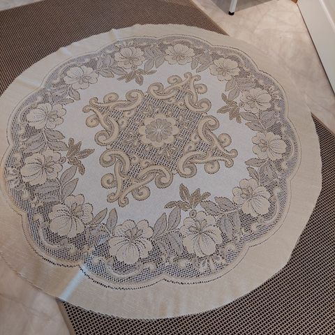 Kaunis, tukeva pöytäliina, pohjassa vuori. Halkaisija 36cm. Keskellä samettia ja reunassa gobeliinikangasta.. Hinta 12, noutaen.