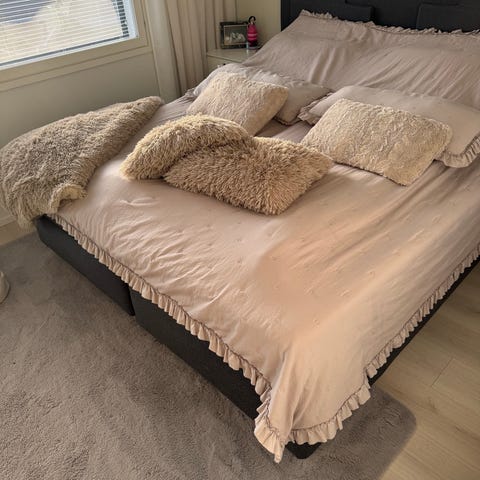 Mustanharmaat päiväpeittoina toimineet 80cm sängyissä. Lähikuva haalistaa liikaa, tuolilla oikea väri. Menee myös osapetauksena leveämmässä sängyssä. Tai voit ottaa ompeluksiin nämä. Eurokankaasta aikoinaan ostettu. Tausta mokkamainen lyhyt tiheä karva. Painavat. Pesty varastoon laittaessa. Näitä kpl kaksi. Yhden hinta 25e, Mmm.