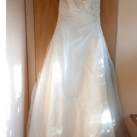 Myydään käytetty olkaimeton häämekko/hääpuku. Mekossa lukee koko 38, mutta mekko on ranskalaisen merkin (Eglantine Creations), joten on pienempi kuin meidän vastaava koko.