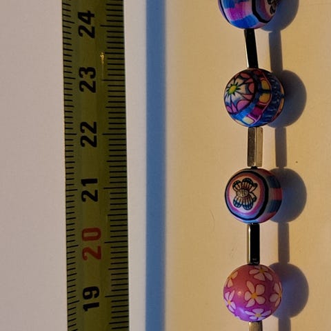 Lyhyt kellertävän sävyinen helmikaulakoru. Ketjun pituus on n. 36 cm. Toimiva lukko. Helmet muovia, hieman kulumaa.