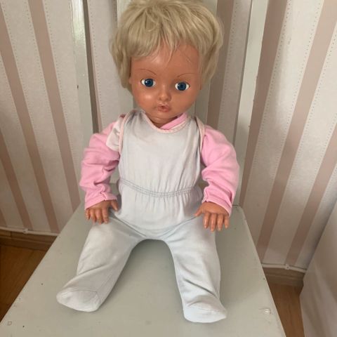 60-kuvun Poikanukke pit 42cm. Pehmeä muovipintainen. Raajat liikkuu. Äänilaite toimii. Leikkimätön nukke. Priimakunto. Hinta sis postituksen. Kouvola