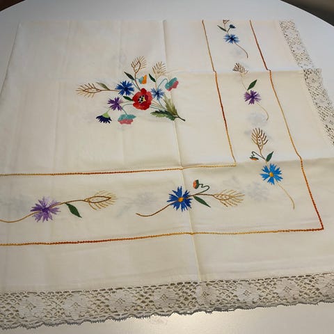 Myydään kuvassa näkyvä pöytäliina koko 136 x 136 cm. Postitus tai ToriDilli.