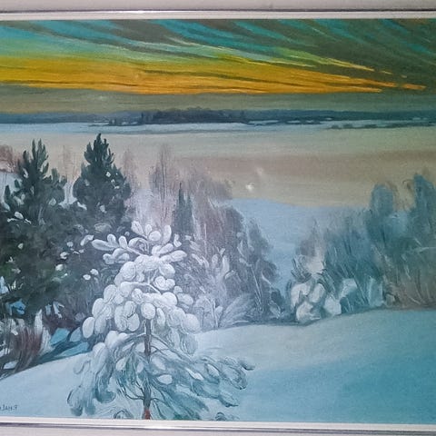 Pekka Halonen veneen tervaaja, väripsainos alkuperäisestä öljymaalauksesta. Taulussa hienot vanhat puu kehykset.