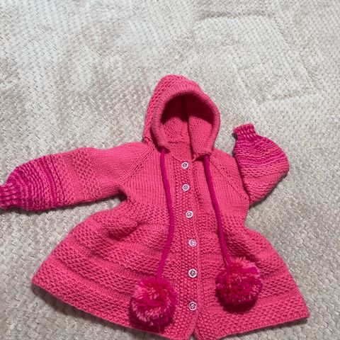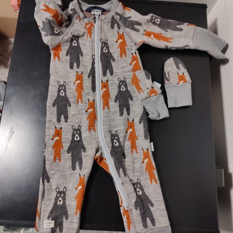Käsin merinovillasta neulottu asu, koko n. 74 (voin ottaa mittoja tarvittaessa). Henkselihousut ja takki yhdellä napilla. Ei ole käytetty, sovitettu vain.oli väärään aikaan sopivan kokoinen.