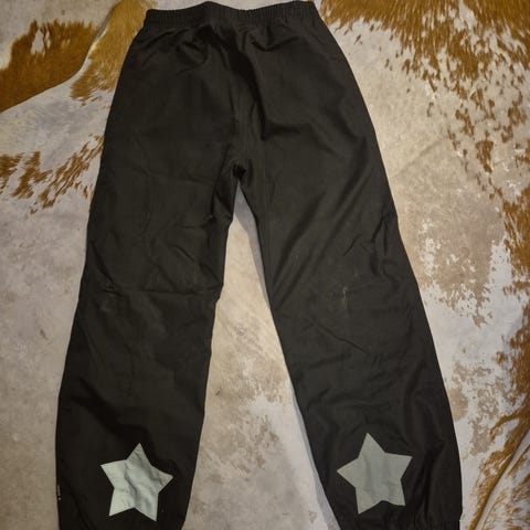 140cm Molon mustat kuorihousut, syksyyn/kevääseen vaikka sellaisenaan tai talvellakin lasketteluun kerrospukeutuen. Lahkeiden tähti-heijastimet kuluneet.