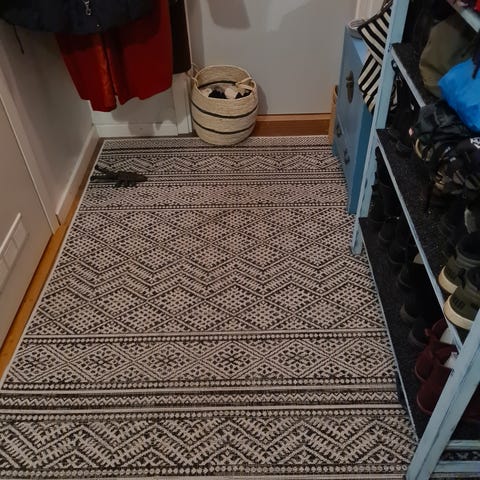 Polypropeeni matto. Beige tummilla raidoilla. Uusi, ei sopinutkaan ajateltuun paikkaan. Ainoa moite on kulmasta josta ottanut osumaa jostain. Ollut lattialla vain kuvien ottamisen ajan.