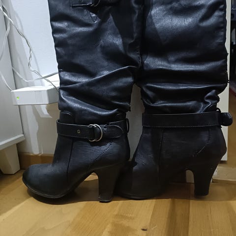 Hyväkuntoiset pari kertaa käytössä olleet karvavuoriset saapikkaat. Materiaali nahka, tekstiili ja tekoturkis. Ihan pieni nirhauma toisessa korossa. Vain nouto