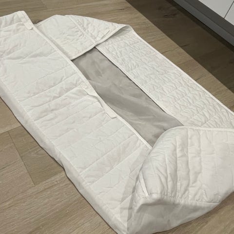 Myydään kuvassa näkyvä pinnasängyn tai muun sängynreunan pehmuke/suoja , pituus noin 137 ja korkeus noin 37 cm.