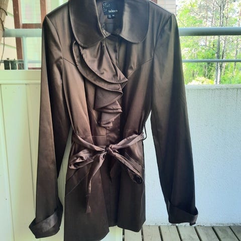 Tyylikäs vuorellinen kevättakki myynnissä. Erittäin kevyt. Silkkiä. Koko noin 38-40. Täysin ehjä Voin tuoda lähialueille tai postittaa eri hintaan