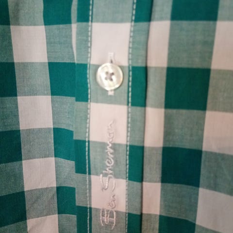Vaalean pastellin vihreä puuvilla paita. Ei tahroja. Koko M (miesten). Mitat kauluksesta helmaan 61cm.