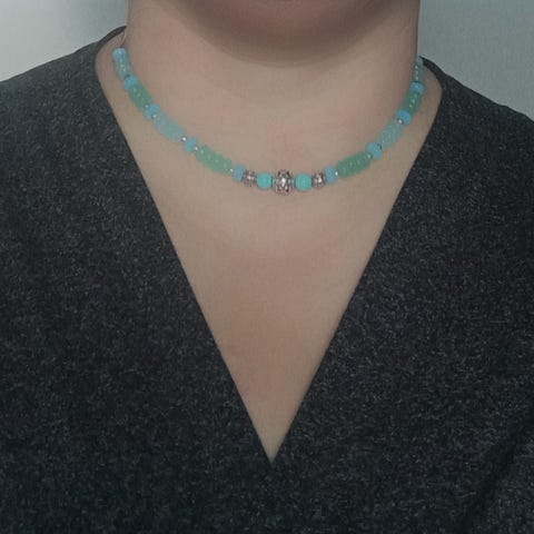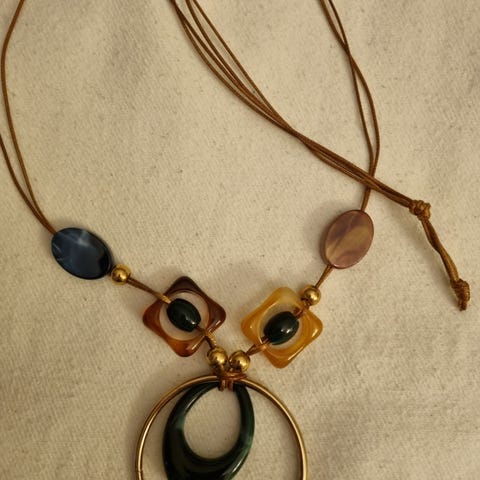 Käyttämätön kaulakoru. Punaisia muovihelmiä. Ruskeita puuhelmiä. Riipusosassa pieniä kulkusia.