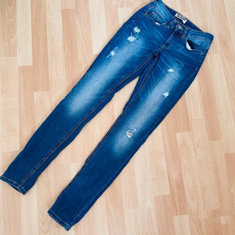 Siniset farkut, koko 36, edessä vetoketju, nappi, edessä taskut + pikkutasku, takana taskut, vyönlenkit, vyötärön mitta 36.5 cm edestä mitattuna, puntin mitta haaroista puntin suuhun 80 cm, puntin sisäsivun lahkeissa vetoketjut, ehjät.