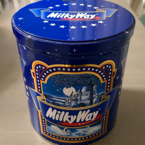 Vanha Milky Way peltipurkki , jossa ollut aikoinaan 80 luvulla myynnissä irtonaisia pikkuisia milky Way suklaapatukoita kaupassa