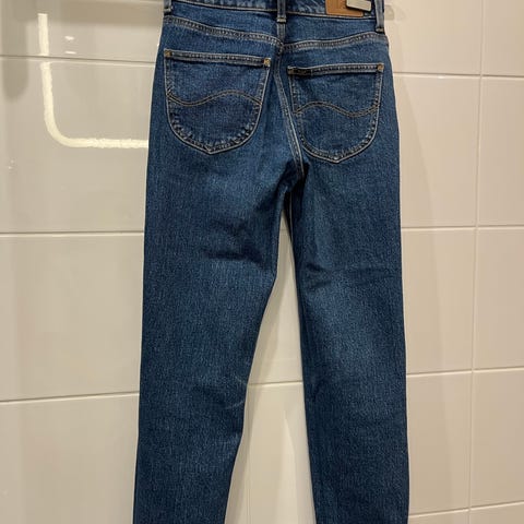 Naisten siniset Lee farkut, koko W24 L31. Molemmissa lahkeensuissa lyhyehkö vetoketju.