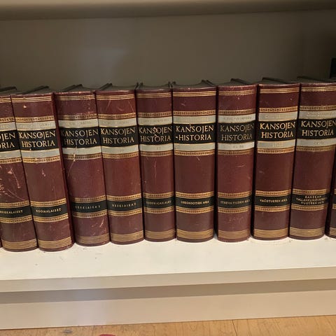 Kirjat painettu vuosina 1883-1887. Kannet hieman kärsineitä, koska niihin ei ole koskettu. Kirjoja ei siis ole käsitelty huonosti tai väärin. (Ihmisihosta irtoava rasva suojaa kansia.). Kovakantiset. Kustantajana Werner Söderström (Porvoo).