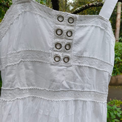 Röyhelömäisesti valkoista pehmeää pitsikangasta hihoissa.