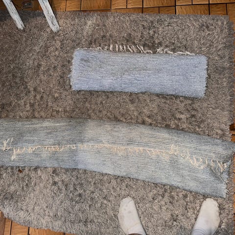 Pitkät "kangasmaiset" suikaleet,jotka tuntuvat jalan alla mukavilta.Materiaali ei tiedossa eikä kuinka vanhat matot ovat.