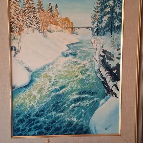 Usko Nyströmin Kolme aittaa. Työn korkeus on 44 cm ja leveys 59 cm. Kehys 53 X 69 cm.