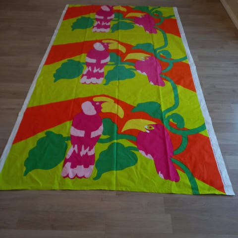 Pirteän värinen kangaspalaa / verho. Väri pysynyt hyvin, mutta parissa kohtaa kangas ei priimaa (kts. kuvat). Marimekko, Maija Isola, Pepe 1972. Kissatalous.