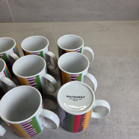 Marimekko, muki, teemuki, 70-luku, vintage, kotimainen, design, kuppi, retro, värikäs, kahvimuki, graafinen, monivärinen, glögitarjoilu, lahjaidea, kattaminen, aamiainen, kattaus, kahvimuki, aamiaismuki vihreä, punainen, keltainen, sininen, turkoosi, oranssi, ruskea, graafiset kuviot, lahjaidea, vintagelahjat, lahjaideat, häälahjaksi, valmistujaislahja, häälahja, ylioppilaalle, vastavalmistuneelle