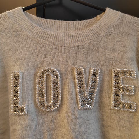 Dinc merkkinen luonnonvalkoinen glitter koristeinen neule. Tämä on hyväkuntoinen lämmin neule. Paidan kuvassa on kaunista liimattua kultaista glitteriä mukana. Luulisin, että tämä neulepaita menee ainakin naisten L koolle riippuen kuinka löysästä tykkää. Mitoiltaan näyttää vastaavan naisten L - kokoisia paitoja. Malli on naisten s kokoa ja sille tämä neule jää hyvin löysäksi paidaksi. Tästä jollekin lämmin ja tosi siisti neule. Kaunis lämmin neule mikä sopii hyvin talven kylmiin päiviin. Kaunis paita mikä on nätti vaikka töissä käytettynä.
