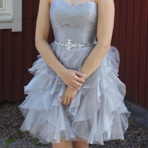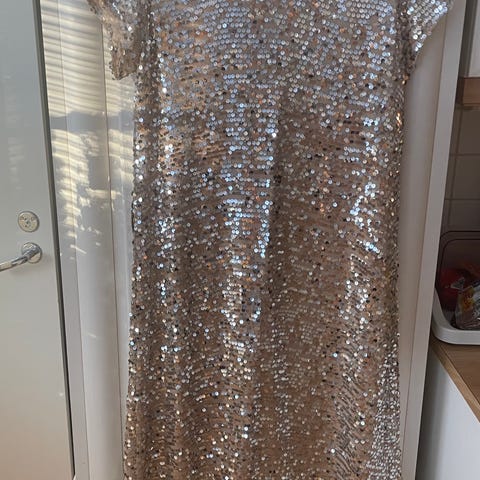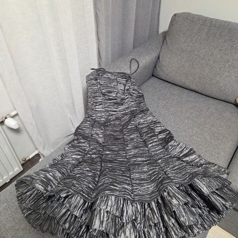 Upea Custommaden tumma hopeakimalteinen juhlamekko. Upeat pitkät pussihihat, hihansuulla kuminauha.