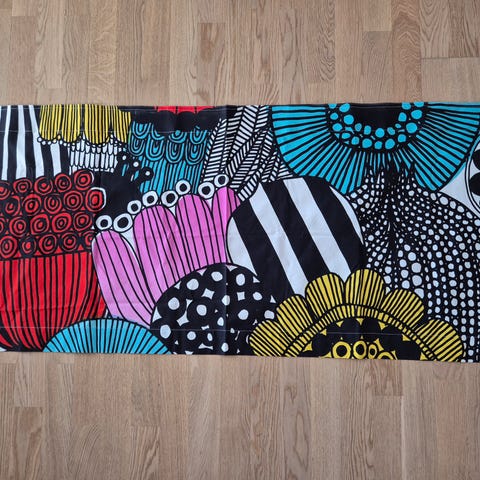 Tästä kevääseen, pääsiäiseen tai muuten värikkääseen sisustukseen. Koko 135x44. Tankokuja 4cm, joku itseommellut. Joskus pidetty. Kaappiin pestynä viikattu. 25370 Pertteli. Mmm.