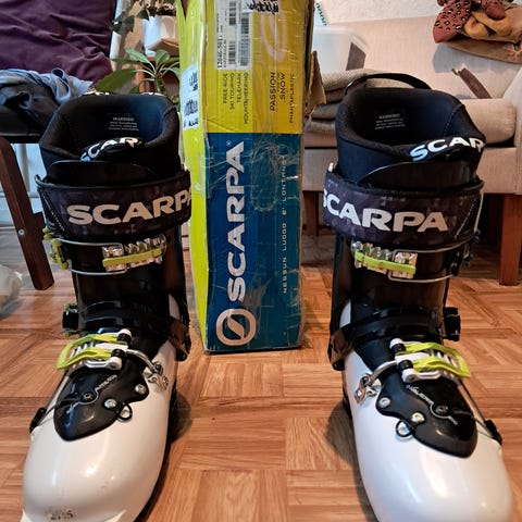Scarpa T2 telemarkmonot, siniset, koko 7.5, ulkopohjan pituus 30cm, pohjallisen pituus 24cm