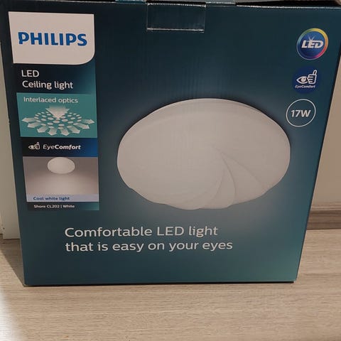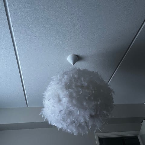 Kattovalaisin, ruskea puurunko, johon vaalea kangas pinnoitettu. Noin 80 cm korkea. Alareunan halkaisija noin 38 cm