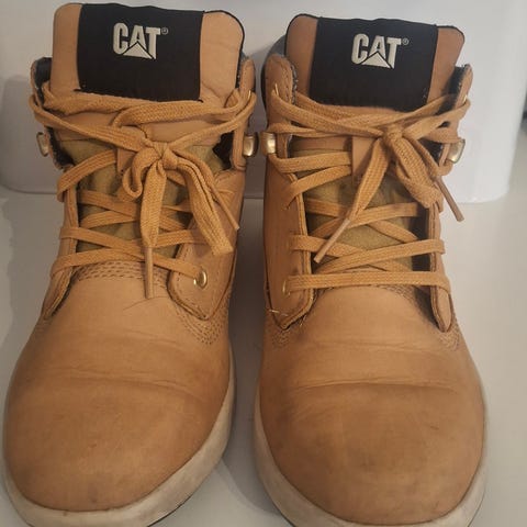 Stockmannilta uutena ostetut ja kerran tai kaksi kuivalla säällä pidetyt (ja liian pieneksi todetut) naisten nahkaiset Catepillar talvikengät koossa 37.