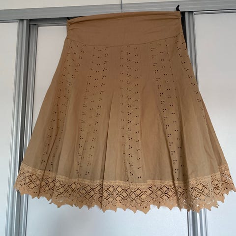Beessin värinen, lyhyt Puolihame, koko 38, takana vetoketju, edessä helmassa halkio, vyötärön mitta 40 cm edestä mitta, pituus 54 cm, siisti.