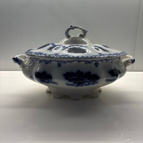 Kannellinen “Sol”-sarjan liemimalja asetteineen (pituus 22 cm) sekä tarjoiluvati (pituus noin 34 cm), valmistanut J. & G. Meakin (Englanti, 1930-luku?). Vadeissa iänmukaista krakeloitumista. Toimituksena vain nouto. Maksu käteisellä.