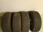 Tästä uuden veroiset, vähän ajetut kesärenkaat peltivanteilla (puoli kesää ehditty ajamaan). Kulutuspintaa vielä hyvin jäljellä.