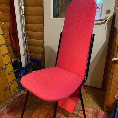 Vanha tuoli, josta selkänojan kääntämällä saa silityslaudan. Istuimen alla säilytystilaa. Verhoiltu uudelleen ja kunnostettu muutenkin.