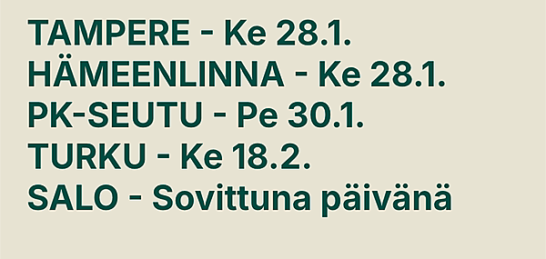 Hyödynnä ilmainen toimitus Turkuun, Helsinkiin tai Tampereelle. Katso toimituspäivät yritys kuvasta.