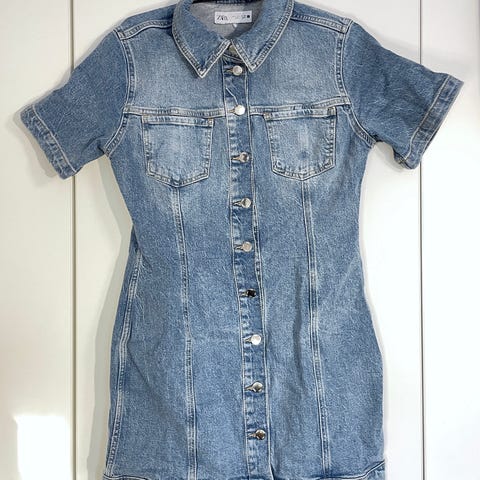 Tummansininen farkkumekko irrotettavilla olkaimilla. Yläosassa napit ja hameosassa lyhyt vetoketju. Mukavan tuntuinen päällä. Joustaa hieman.