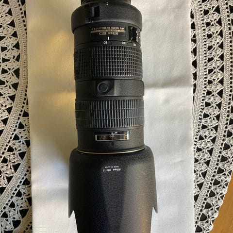 Nikonin täyskennoiselle kameralle tarkoitettu objektiivi F -bajonetilla.