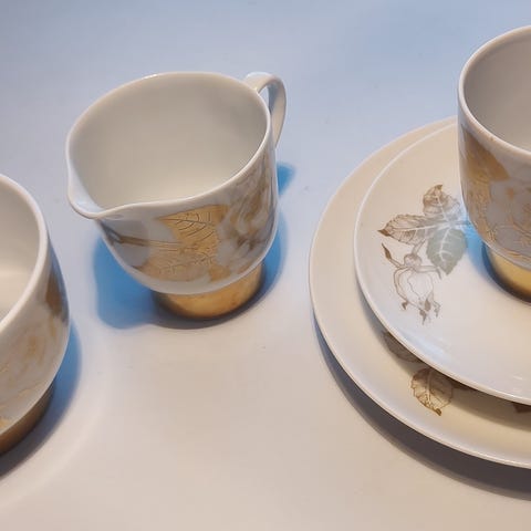 Myydään viisi settiä Arabian upeita Kultaruusu kahvikuppeja, lautasia ja pullalautasia 30€/setti.