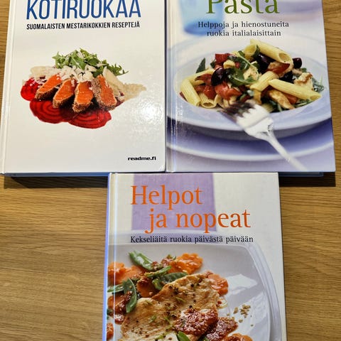 Keittokirjat "Tarjoa hyvää vähällä vaivalla" ja "Pasta" 2 EUR/kpl.