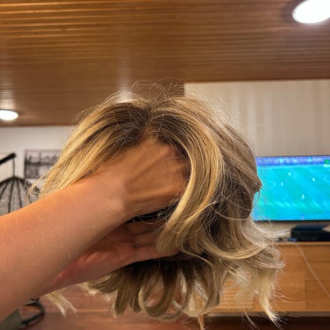 Your Present vaaleanruskea kihara peruukki, jossa on verkkomallinen sisäpinta. Peruukki on on vaaleanruskea väri sekä kihara malli.