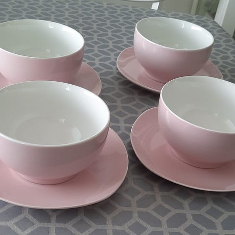Moko sarjan 10 kpl vaaleansinisiä lautasia, ehjiä. Halkaisija 19 cm. Yhdessä aivan pieni särö reunassa ( kuva).