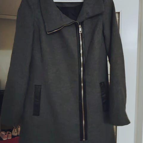 Guessin villakangastakki. Harmaan sävyinen. Sisävuori pehmeää luonnonvalkoista kangasta.