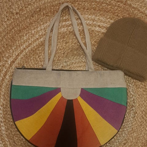 Uusi. Itse tehty kangaskassi. korkeus 27.5cm, leveys 31.5 cm.