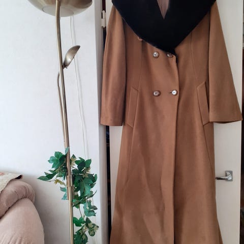 Välikausitakki, koko 42. Menee niin syksyllä kuin varhaiskeväällä. Materiaali parasta mahdollista: kashimiriä ja villaa. Hattu mukaan, se on lierihattu, villakangasta. Hienossa kunnossa takki ja hattu.