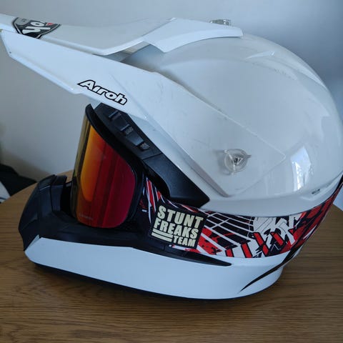 Siitä L koon ravenin kypärä ja armegan ajolasit. Kypärää on käytetty kahden kesän ajan ja jossain vaiheessa hukkui tuo päälimmäinen lipan kiristysruuvi ilmeisesti löystyi ja lensi vauhdissa jonnekkin mutta ei vaikuttanut ajaessa mitenkään erityisesti. Sitten näkee kuvasta myös että leuan alle tulevista pehmusteista toinen revennyt jonkin verran mutta itseä ei häirinnyt ainakaan. Lasit ovat kuin uudet ja linssin saa helposti vaihdettua pikalukituksilla jos tarvitsee. Kypärälle tulee mukaan säilytyspussi. Myyn myös erikseen hinta kypärälle 30€ ja lasit 40€