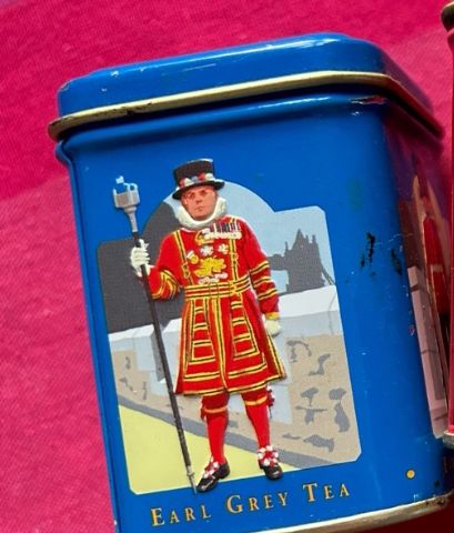 Valkoinen kannellinen peltirasia lilalla Bisquits-tekstillä. Mitat: pituus 18cm, leveys 15cm ja korkeus 15cm.